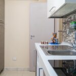 - fully equipped kitchen with utensils, refrigerator, and coffee machine